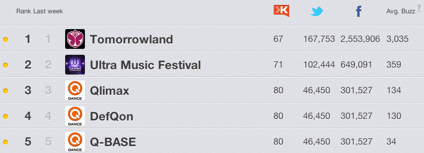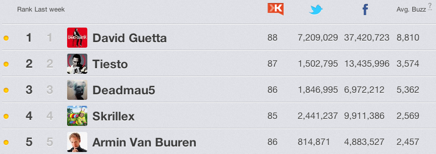 Tijd voor de einde jaarlijsten. Hoe doet iedereen het? Welke artiesten staan waar? Hoe zit het met de festivals? Hoe zit het met de DJ’s? Hoe zit het met de clubs? Kortom hoe eindigt 2012 op Social Media? Hieronder een aantal lijstjes via Rankingz.